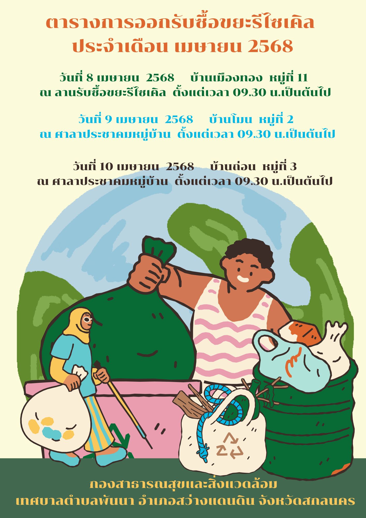 รายละเอียด : ประชาสัมพันธ์การออกรับซื้อขยะรีไซเคิล ตามโครงการธนาคารขยะพัฒนาสู่ชุมชนเทศบาลตำบลพันนา ธนาคารขยะบ้านเมืองทอง ประจำ เดือน เมษายน ปีงบประมาณ 2568