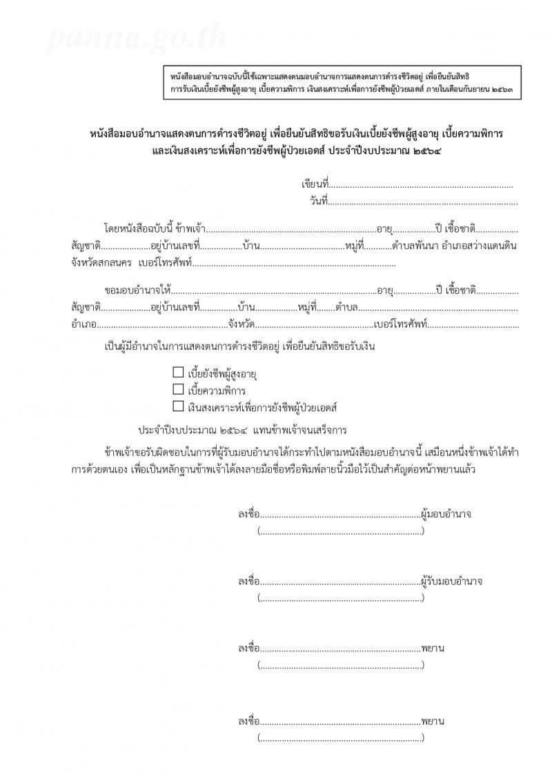 หากท่านไม่สามารถมาแสดงตนได้เอง สามารถมอบอำนาจให้บุตรหลาน หรือผู้ดูแลมาแสดงตนแทนได้ โดยมีหลักฐานเอกสารมาแสดงต่อเจ้าหน้าที่ ดังนี้
