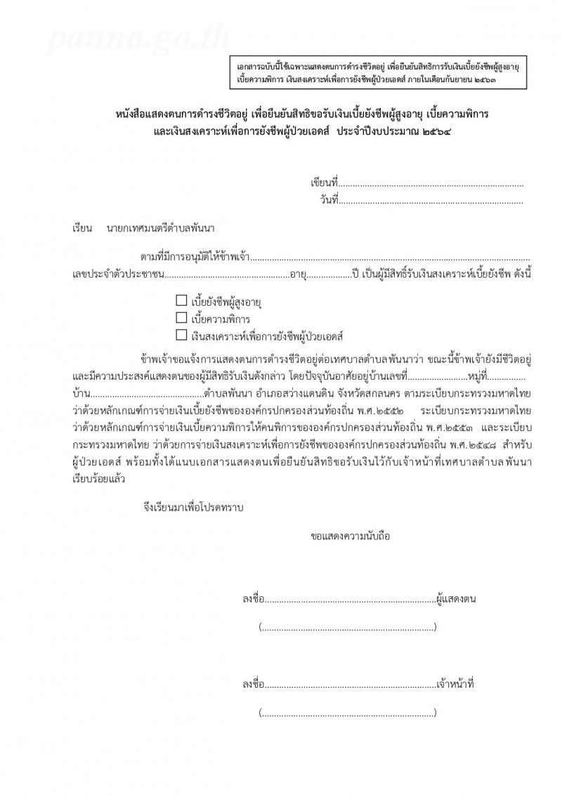 เทศบาลตำบลพันนา ขอให้ผู้ที่มีสิทธิรับเบี้ยยังชีพ แสดงตนยืนยันสถานะดำรงชีวิต และยืนยันความประสงค์ในการรับเงินเบี้ยยังชีพผู้สูงอายุ เบี้ยความพิการ และเงินสงเคราะห์ผู้ป่วยเอดส์ โดยเตรียมหลักฐานประกอบการยืนยันตนตามเอกสารแนบท้าย
