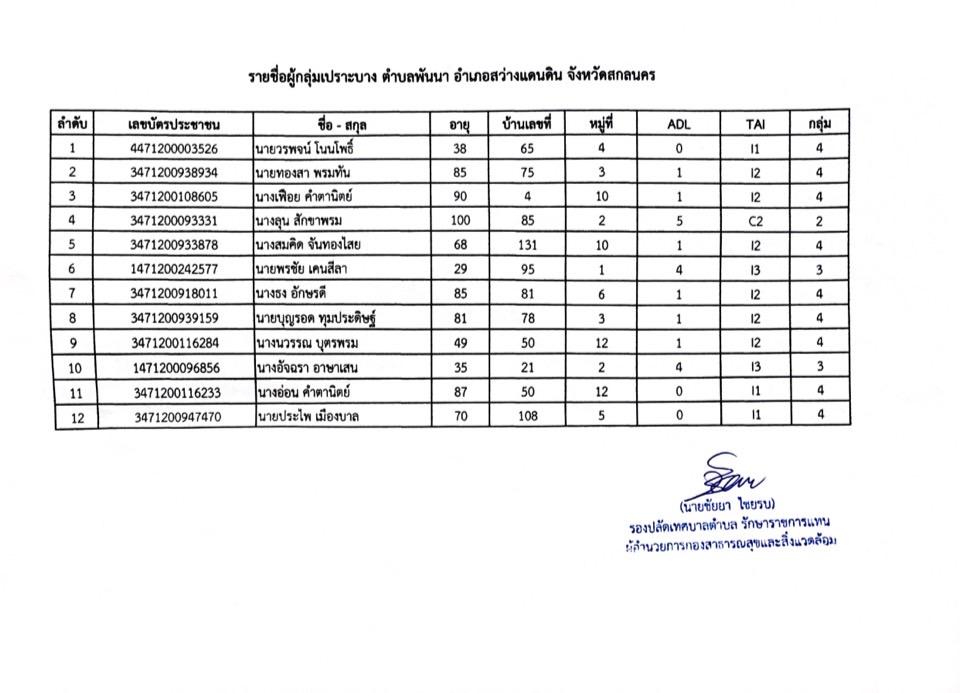 รายชื่อกลุ่มเปราะบาง ตำบลพันนา อำเภอสว่างแดนดิน จังหวัดสกลนคร